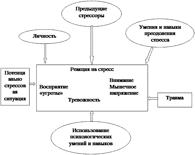 Из рисунка видно, что взаимосвязь между спортивными травмами и психологическими факторами рассматривается, главным образом, как обусловленная срессом. В частности, потенциально стрессовая спортивная ситуация (например, соревнование, тренировка, плохое выступление) может способствовать травме в зависимости от спортсмена и от того, насколько «угрожающей» он считает данную ситуацию. Ситуация, воспринимаемая как угрожающая, ведёт к повышению тревожности, что в свою очередь вызывает целый ряд в концентрации внимания и мышечном напряжении. Всё это повышает вероятность получения травмы. Однако стресс – не единственный психологический фактор, который влияет на вероятность получения травмы. Как видно из рисунка, свойства личности, предыдущие стрессоры (факторы напряжения) и предпосылки, позволяющие справиться со стрессом, также оказывают влияние на процесс стресса и, следовательно, на вероятность травмирования. Более того, в случае получения травмы эти же факторы влияют на процесс реабилитации и восстановления. Также видно, что люди с развитыми психологическими навыками и умениями (например, постановка цели, идеамоторные акты, релаксация) лучше справляются со стрессом, что снижает как вероятность получения травмы, так и степень стресса, обусловленного травмой.