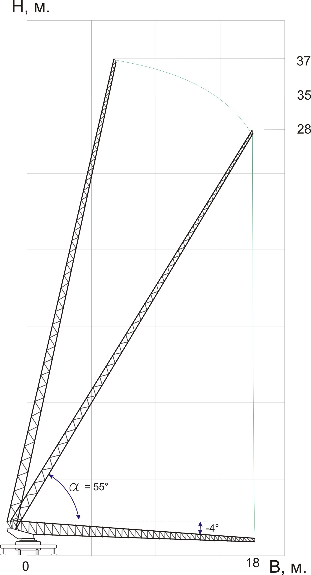 Рисунок 8. Рабочее поле (зона досягаемости) АЛ-37. Н – высота подъема стрелы, м., В – вылет стрелы, м.