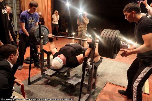 Еще одно важное упражнение для жимовиков – французский жим. Всем известно, что французский жим лежа со штангой является уж если не самым, то одним из самых главных для проработки трицепсов. Очень часто боли и дискомфорт в локтях и запястьях заставляют от этого упражнения отказываться. Открою еще один секрет, с помощью которого мне удалось помочь многим избавиться от боли в локтях и продолжить тренировать трицепсы, используя французский жим лежа со штангой. Надо всего лишь не ставить жим первым упражнением в программу. Можно сначала выполнить, например, разгибания рук на блоке, либо разгибания руки с гантелью из-за головы попеременно, и лишь затем перейти к выполнению французского жима. Очень действенно! Поверь мне, Дим! А ты, стало быть, пока не жмешь? Пока делаю только дожимы. Причем, высоту такую подбираю, чтобы ни малейших болевых ощущений не было. Одно время, давно уже, когда я еще не обладал достаточным опытом тренировок и знаниями, меня мучили при жиме боли в плече – где-то между бицепсом и трицепсом. По всей видимости, связки. Через месяц тренировок эта боль приходила ко мне стабильно. После этого приходилось бросать жим и ждать от месяца и больше, пока не пройдет. С началом тренировок – через месяц опять эта боль. И так продолжалось, пока я не снизил количество тренировок на жим до двух в неделю и не перестал каждую неделю делать «лесенку» до максимального веса. Ну что же, у меня сегодня тоже будут дожимы, причем, очень тяжелые. Будешь страховать меня. – Вова достал брусок 100х70 мм. – Жать будем с него. Годится, – согласился с ним я. – И до какого веса пойдешь? Сам не знаю пока, как пойдет, – начал кокетничать Владимир. …Травмах «Ладно, все сам увижу», – подумал я, и мы начали разминку. А у тебя были какие-то травмы? – полюбопытствовал я у Вовы во время одевания на него «боевой» жимовой рубахи «Дабл Рейдж Икс». Тьфу-тьфу, пока удается избегать. Но ко мне обращалось довольно много спортсменов с различными травмами. И как – ты смог им помочь? Кому-то – да. Причем, что удивительно, многим. Молодой человеческий организм – довольно хорошо заживающая штука. Его ломают, а он борется. И какие чаще всего травмы у пауэрлифтеров тебе попадаются? – полюбопытствовал я. Именно у «лифтеров» чаще всего проблемы с позвоночником. Да и у обычных «физкультурников» их хватает. Протрузии, грыжи. Да. Я довольно часто встречал спортсменов, для которых грыжи позвоночных дисков стали крестом на карьере в пауэрлифтинге. К счастью, сейчас проводится довольно много соревнований по жиму лежа, и можно реализовать себя там. И что же ты рекомендуешь тем, у кого возникла грыжа межпозвоночного диска? Оперировать грыжи – это последнее, что можно предложить. Как правило, операцию делают, когда происходит разрыв плевральной оболочки диска, и диск выдавливается наружу. При этом происходят защемления и прочие «радости» с корешками нервов позвоночного столба. Если же наблюдается сдавливание диска и протрузии, то можно попробовать восстановиться примерно таким образом. Первое, с чего следует начать, это сходить к грамотному мануальному терапевту, которого советуют не рекламные объявления, а авторитетные люди. Задача мануального терапевта – не стремиться во что бы то ни стало вправить тебе диск на первом же сеансе, а просто размять сустав под названием позвоночник. Далее д