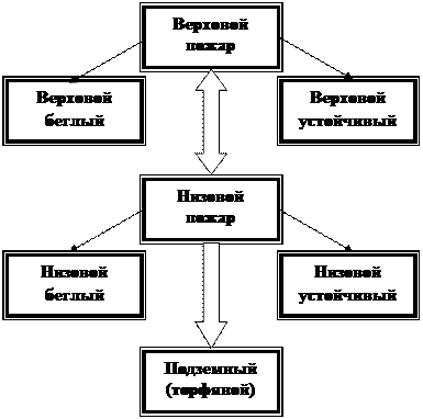 В зависимости от того, в каких элементах насаждения распространяется огонь, лесные пожары бывают: низовые; верховые; подземные (почвенные).