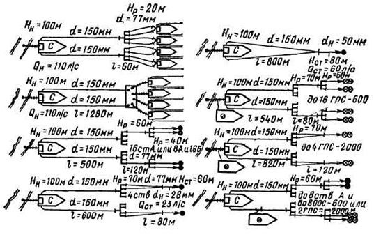 Рис. 3.4. Схемы боевого использования пожарной автонасосной станции ПНС-110 (указанные в схемах расстояния приняты без учета подъема местности)