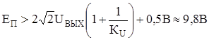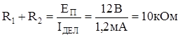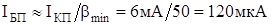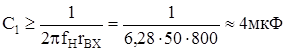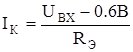 Пусть на вход схемы подано переменное напряжение такой частоты, что импеданс конденсатора С2 невелик по сравнению с RН. Рассмотрим простые физические соображения, которые позволяют рассчитать этот усилительный каскад. Поскольку транзистор относительно коллекторной цепи является стабилизатором тока, то его выходное сопротивление можно считать равным бесконечности. Поэтому выходное сопротивление, складывающиеся из параллельно включенных сопротивлений источника тока и RК, равно просто RК; и rВЫХ=RК. Для того чтобы величина RН не влияла на величину выходного сопротивления, необходимо, чтобы rВЫХ<<RН, т.е. RК<<RН (реально выбирают RК<(0,1¸0,2)RН). Чтобы амплитуда переменного напряжения на коллекторе могла достигать максимальных значений без искажений, в отсутствие входного сигнала надо установить UК»ЕК/2, что при выбранном значении RК однозначно определяет коллекторный ток покоя каскада (IКП). Из условия KU=-RК/RЭ можно вычислить значение напряжения на базе в отсутствие входного сигнала UБП, соответствующее протеканию тока IКП. UБП=UЭ+0,6В=RЭIКП+0,6В, зная значение UБП, легко вычислить параметры входных цепей (С1, R1, R2), так как они ничем не отличаются от схемы с ОК. Пример. Необходимо рассчитать усилитель с параметрами КU=‑10, UВЫХ=3В, RН=10кОм, fН=50Гц, используя транзистор с bmin=50. 1. Вычислим напряжение питания. Размах выходного напряжения на коллекторе равен UВЫХ×2 2. Из условия RК£(0,1¸0,2)RН находим RК£1¸2кОм. Выбираем RК=1кОм, RЭ=RК/КU=100Ом. 3. Вычисляем IКП и UБП. 4. Так как ток покоя базы равен Из условия (6) находим