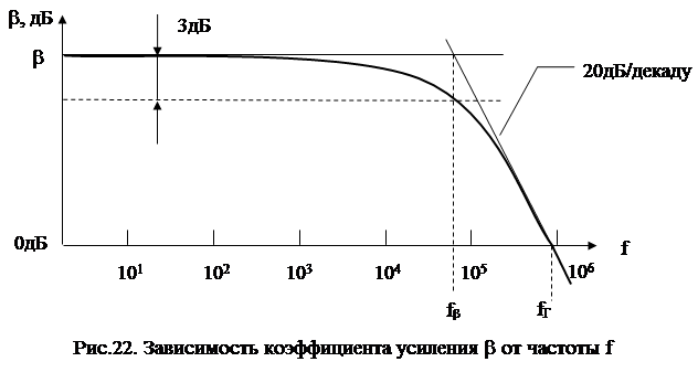 Наиболее наглядно эта зависимость может быть представлена в логарифмическом масштабе (рис.22). На частотах f>fb, b уменьшается 20дБ/декаду, т.е. при увеличении частоты в 10 раз b уменьшается в 10 раз, а при некоторой частоте fГ становится равным единице (0 дБ). Поэтому в области частот от fb до fГ выполняется соотношение b(f)×f=fГ (32) или