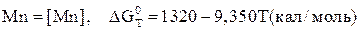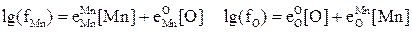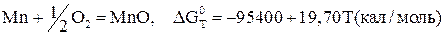 Пример. Рассчитать равновесную концентрацию кислорода в жидком железе при раскислении его марганцем ([Mn,%]=0,3...1,2) при температуре 1600 0C. Определить минимальное содержание кислорода в железе при раскислении его марганцем. При взаимодействий марганца с растворенным в железе кислородом происходит образование твердого оксида в соответствии с реакцией вида
