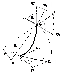 жидкости, которая одновременно и вращается. Такое сложное движение затрудняет его математическое описание. В связи с этим прмем следующие условия: 1) количество лопаток рабочего колеса стремится к бесконечности; 2) по каналам протекает идеальная жидкость. Соблюдение этих условий позволяет рассматривать каждый канал бесконечно малых размеров, по которым протекают элементарные струйки идеальной жидкости, где отсутствуют силы трения. Для получения теоретического уравнения работы центробежного насоса из условного рабочего колеса с бесконечно большим количеством лопаток вырежем одну из них (фрагмент А на рис.6.1) и поместим ее отдельно (рис.6.2).Каждая частица жидкости, попадая на начало лопатки, обладает абсолютной скоростью С1,которую можно разложить на два вектора: U1 - окружную и W1 - относительную в виде параллелограмма скоростей на входе в проточный канал. На конце лопатки каждая частица жидкости уже будет обладать другой абсолютной скоростью С2, которая разлагается тоже в виде параллелограмма на векторы: U2 - окружная скорость на выходе и W2 - относительная скорость на выходе. Так как скорость частиц меняется от С1 до С2, то изменение момента количества движения можно записать в виде: DМ = М2 - М1, где М2 - момент количества движения элементарной массы жидкости m, обладающей скоростью С2, а М1 - момент количества движения той же массы m, обладающей скоростью С1. Из теоретической механики известно, что момент количества движения равен произведению массы на скорость и на плечо, т.е. расстоянию от вектора скорости до точки, относительно которой определяется момент. Значит М = m · С· h. (6.1)
