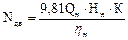 где Qн и Нн - расход и напор насоса, снятые с его характеристики по правой (для центробежных насосов) или левой (для осевых) границе рабочей области, К - коэффициент запаса, принимаемый в зависимости от мощности, hн.- коэффициент полезного действия насоса в долях от единицы, снятый также по характеристике при Q = Qн . Тип исполнения двигателя - горизонтальный для насосов Д, НД и К и вертикальный - для насосов О, Оп и В.