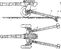 состоящая из центрального короба и двух продольных балок. Сверху к крестовине приварено кольцо 2, обеспечивающее соединение нижнего станка с вращающейся частью орудия. К боковым кронштейнам крестовины шарнирно прикреплены откидные опоры 3, разворачиваемые в стороны при переводе орудия в боевое положение, что обеспечивает возможность кругового обстрела без потери устойчивости. Крестовина, продольные балки и откидные опоры являются сварными коробчатыми конструкциями. Это несколько облегчает их, но обычно Четырехстанинный лафет является относительно тяжелым, поэтому применяется в зенитных орудиях. В боевом положении лафет опирается на грунт поддоном 6 крестовины и четырьмя домкратами. Забивные сошники обеспечивают отсутствие скольжения лафета по грунту. Для этого к каждой станине привариваются специальные кронштейны с прорезями для перьев забивных сошников. В танковых и самоходных артиллерийских установках нижним станком является корпус боевой машины. Наличие гусеничного хода позволяет получить в этих орудиях относительно небольшие удельные давления на грунт. Элементы сцепления гусениц с фунтом дают возможность вести стрельбу без сошников. В мощных самоходных установках со значительной силой отдачи, а также в легких гусеничных боевых машинах подобной связи с грунтом недостаточно. Для обеспечения неподвижности орудия в этих случаях часто используются откидные сошники, которые при выстреле упираются в грунт. Подъем и опускание откидных сошников обеспечивается специальными гидравлическими приводами. Обеспечение устойчивости и неподвижности орудия на грунте во время выстрела зависит от расположения опорных частей лафета относительно грунта. При проектировании орудий считают, что в нормальных условиях стрельбы оно размещается на ровной горизонтальной площадке. В действительности же поверхность грунта всегда имеет некоторые неровности. Наличие таких неровностей влияет на устойчивость и неподвижность орудия при выстреле,