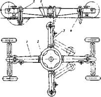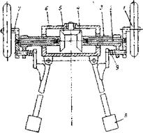 Рис. 3.91. Схема механизма самоустанов: 1 - колесо; 2 - торсион; 3 - труба; 4 - шестерня; 5 -шестерня паразитная; б - лобовая коробка; 7 -полуось; 8 - хоботовый лист; 9 - механизм выключения трассиона.