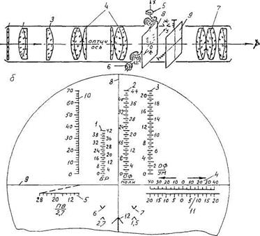 Условия стрельбы прямой наводкой по движущимся наземным целям существенно отличаются от условий стрельбы по неподвижным целям. Во-первых, требуется большая скорострельность, что может быть выполнено только при непрерывной наводке орудия без производства каких-либо установок по внешним шкалам прицела со стороны наводчика. Во-вторых, стрельба по движущейся цели требует от прицела большого поля зрения Поэтому противотанковые и танковые прицелы снабжены специальными механизмами углов прицеливания и бокового упреждения Действие этих механизмов вызывает необходимые перемещения сетки в вертикальном и горизонтальном направлениях относительно нулевой главной оптической оси прицела и неподвижного перекрестия. Кроме того, в этих прицелах имеются механизмы выверки прицела по высоте и направлению после установки его на орудие В процессе стрельбы перекрестие остается неподвижным, а углы прицеливания и упреждения устанавливаются по внутренним шкалам прицела (шкалы на сетках), путем перемещения сетки в вертикальном и горизонтальном направлениях относительно перекрестия. На рис. 5.17, а представлены основные элементы оптической системы телескопического противотанкового прицела ОП-4. Система включает светофильтр 1, объектив 2, коллектив 3, линзы оборачивающей системы 4, сетку 8, перекрестие 9 и окулярную группу 7. Условно показаны механизм упреждения 6 и механизм углов прицеливания 5, с помощью которых каретка сетки 8 может перемещаться поперек оптической оси по горизонтали (ось Y) и по вертикали (ось X). Сетка 8 установлена в задней фокальной плоскости второго трехлинзового компонента оборачивающей системы 4. На сетке (рис 5 17, б) нанесены: дистанционные шкалы 1, 2 и 3 (в гектометрах), шкала боковой составляющей скорости цели 4 (в км/ч), дальномерная шкала 5, угольники 6 и 7 для определения дальности прямого выстрела по целям высотой 2,7 ми 1,5 м и прицельный знак 12. На поле зрения сетки просматривается перекрестие с вертикальной 8 и горизонтальной 9 нитями Оптический прицел а