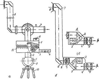 АРТИЛЛЕРИЙСКАЯ БУССОЛЬ. Перископическая артиллерийская буссоль является основным прибором батареи и дивизиона и предназначена для измерения магнитных азимутов и дирекционных углов, измерения горизонтальных и вертикальных углов на местности и определения расстояний и дистанций до точек на местности. Кроме того, с помощью этой буссоли определяются значения синусов углов, производится разбивка фронта батареи и расстановка орудий. В комплект прибора входят буссоль, перископ, тренога и освещение с аккумуляторной батареей. Буссоль (рис 5 24, а) включает в себя шаровую пяту 1 с осью 2, нижнее поворотное основание 3 с магнитной стрелкой 4, верхнее поворотное основание 5 с шаровым уровнем 6, качающуюся часть с монокуляром (зрительная труба) 7 и перископ 8. Поворотом пяты 1 в шаровой цапфе 9 треноги 10 по уровню 6 производится горизонтирование оснований 3 и 5 буссоли. Поворотом нижнего основания 3 в горизонтальной плоскости производится ориентирование буссоли по магнитному меридиану с помощью магнитной стрелки 4 Поворотом верхнего основания 5 с качающейся частью и монокуляром 7 относительно нижнего основания 3 производится ориентирование монокуляра 7 в горизонтальной плоскости и отсчет углов по азимуту. Поворотом монокуляра 7 в вертикальной плоскости производится отсчет вертикальных углов. Углы поворота верхнего основания 5 и монокуляра 7 отсчитываются в тысячных по шкалам грубого (цена деления 1-00) и точного (цена деления 0-01) отсчета Цена деления шарового уровня 0-03. Перископ 8 (оптическая насадка может устанавливаться вертикально, наклонно и горизонтально) применяется при работе с буссолью из-за укрытия.