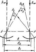 Рис 5.25 Изображения предмета обозначены кружочками. При наличии линейного параллакса (р При выборе линейного параллакса с помощью поворота оптического компенсатора К (клиновидная пластинка), то есть при р = о, цель А и марки будут казаться совмещенными по глубине. Перемещение компенсатора при совмещении изображения предмета и марки передается на дистанционную шкалу Д, нанесенную на оправе компенсатора, по которой можно прочесть дальность до цели.