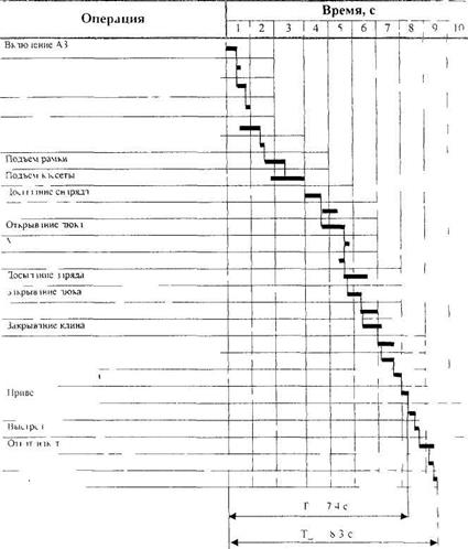 Одновременно с расстопориванием вращающегося транспортера начинается приведение пушки (приводом вертикального наведения стабилизатора) к углу заряжания и фиксация качающейся части 6 на башне электромеханическим стопором 7. Приведение пушки на угол заряжания совмещено во времени с вращением транспортера до подачи кассеты со снарядом требуемого типа в плоскость подъема на линию досылания. На ограждении пушки шарнирно установлена рамка 9, на которой смонтирован механизм улавливания 8 поддона (после выстрела и экстракции) и его выброса из боевого отделения через люк 5 в крыше башни. С некоторым смещением во времени после начала подъема рамки механизма улавливания и удаления поддонов его электромеханическим приводом 10 начинается подъем кассеты механизмом подъема до положения вывода снаряда на линию досылания. После фиксации кассеты механизмом подъема и отстопорения снаряда от кассеты, производится досылание снаряда со средней скоростью примерно 2 м/с. Далее следует возврат цепи досылателя, открывание люка 5 и удаление поддона. После окончания возврата цепи досылателя механизм подъема 3 опускает кассету, выводя заряд на линию досылания. Досылание заряда и закрывание люка также совмещены во времени. В конце хода досылания заряда (скорость примерно 2 м/с) гильза смещает экстракторы, удерживающие клин в открытом положении, после чего начинается закрывание затвора и возврат цепи досылателя. После возврата цепи досылателя в исходное положение появляется возможность опускания кассеты во вращающийся транспортер, что и производится механизмом подъема. Опускание кассеты из положения досылания заряда, позволяет начать опускание рамки механизма улавливания поддона и только после полного завершения этих двух перемещений появляется возможность расстопорить пушку и привести ее стабилизатором к углу стрельбы. Далее оператор уточняет наводку, пушка попадает в зону, определяемую контактами разрешения выстрела, и производится выстрел. В начале наката производится открывание клина, экстракция поддона и его фиксация в механизме улавливания, о чем подается сигнал в систему управления. Если поддон не зафиксирован в механизме улавливания (электрический сигнал с контакта механизма улавливания не поступил в систему управления), цикл заряжания прерывается и в информационном поле наводчика загорается транспарант: «Вставь поддон» Наводчик должен взять упавший напол боевого отделения поддон и вручную вставить его в механизм улавливания до положения надежной фиксации, о чем будет свидетельствовать потухание аварийного сигнала. Неулавливание поддона является наиболее частым отказом A3. На рис 6.11 приведена циклограмма работы A3 и производства выстрела танка Т-90.