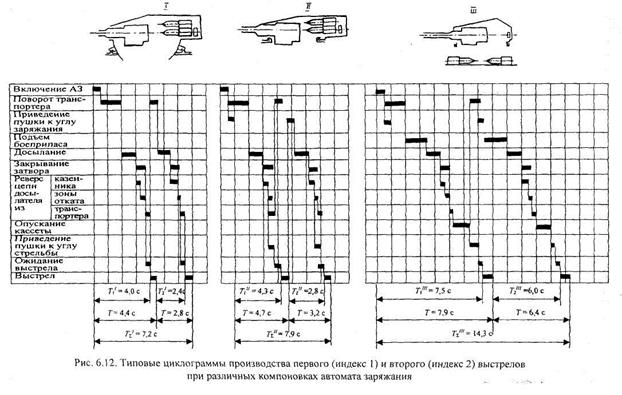 Как видно из приведенных циклограмм, переход от схемы III к схеме II приводит к снижению продолжительности цикла заряжания на 3,2 с, а реализация схемы АЗ по схеме I сопровождается уменьшением продолжительности цикла на 0,3 с. Однако недостатками качающейся башни являются: изменение уравновешенности качающейся части по мере использования боекомплекта; необходимость увеличения массы для обеспечения защиты качающейся части; уменьшение плотности компоновки ввиду увеличения обметаемого качающейся частью пространства. Общие направления снижения продолжительности цикла АЗ включают повышение скорости движения боеприпаса во всех операциях цикла и реверса исполнительных механизмов; сокращение пути перемещения боеприпаса от его положения в боеукладке до каморы орудия; совмещение операций во времени. В А3 отечественных танков скорость досылания не превосходит 2 м/с, на корабельных автоматических артиллерийских установках такого же калибра достигает 12 м/с. Уменьшение пути перемещения боеприпаса достигается возможностью вращения боеукладки в обе стороны и порядком раскладки боеприпасов по типам (если имеется дополнительная информация по номенклатуре предполагаемых целей) чередованием или группами. Очевидно, чем меньше габариты (калибр), чем меньше типов боеприпасов, чем меньше величина автоматизированного боекомплекта, тем меньше продолжительность цикла заряжания.