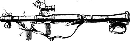 Рис. 7.9. Ручной гранатомет: 1 - механический прицел; 2 - оптический прицел; 3 - ствол; 4 - ударно-спусковой механизм дальность прямого выстрела по танкам 400...800 м, эффективная -1000... 1500 м, максимальная - до 7000 м. В настоящее время существует несколько вариантов ДРП. Простейшие их типы - ручные и станковые противотанковые гранатометы. Они являются одним из самых мощных средств ближнего боя. Ручные гранатометы (калибр 40...65 мм) состоят из тонкостенной трубы с рукояткой, в которой монтируется ударноспусковой механизм, и прицельного приспособления. Стрельба из них ведется с плеча кумулятивными надкалиберными гранатами на дальность порядка 100 м (рис. 7.9). Станковые гранатометы (калибра 80...90 мм) имеют дополнительно ходовую часть и предназначены для поражения бронированных целей на дальностях до 1500 м. Стрельба из них ведется калиберными кумулятивными гранатами. Безоткатные орудия в общем случае состоят из следующих составных частей: ствола с затвором, станка с механизмами наведения, колесного хода, подрессоривания и прицельных приспособлений (рис. 7.10). Стволы безоткатных орудий могут быть гладкостенными и нарезными. Нарезные стволы не нашли широкого применения. Заряжается орудие с казенной части, для чего предусмотрен затвор. Заряжание может быть гильзовое или безгильзовое. Гильза, как правило, перфорированная, то есть имеет многочисленные отверстия. Чтобы порох не высыпался, эти отверстия закрываются тонкой пленкой. Если есть отверстие в дне (поддоне), оно закрывается специальным диском форсирования из плотного картона или пластмассы, создающим в начале выстрела замкнутый объем, тем самым обеспечивая стабильность баллистики и более полное использование порохового заряда. При безгильзовом заряжании пороховой заряд размещается, как и у мин, на длинной трубке стабилизатора. Воспламенение заряда осуществляется от капсюльной втулки или с помощью электрозапальных устройств. Ствол безоткатного орудия состоит из трубы, каморы и затвора. Иногда труба составляется из двух частей: дульной и казенной, соединяемых при помощи специальной муфты. Камора располагается в казенной части ствола, служит для размещения зарядного устройства с зарядом и представляет собой полый цилиндр, имеющий внутри четыре полозка для направления выстрела при заряжании. Камора соединяется с трубой на резьбе. Ствол шарнирно соединяется со станком при помощи специального штыря, входящего в гнездо станка, или цапфенной обоймы, позволяющей стволу поворачиваться в горизонтальной и вертикальной плоскостях. Прицельные приспособления, соответственно, крепятся на специальном кронштейне или непосредственно на обойме. В дульной части ствола имеются рукоятки для перекатывания орудия вручную, а на системах крупного калибра - еще и шворневая балка для соединения с тягачом на походе.