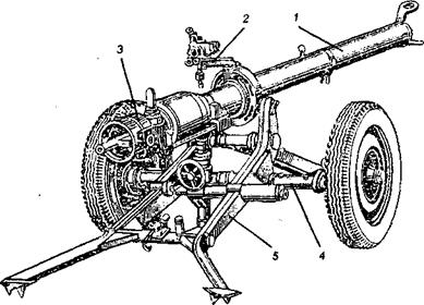 Рис. 7.10. Безоткатное орудие: 1 - ствол; 2 - прицел; 3 - затвор; 4 - ход с подрессорированием; 5 - станок с механизмами наводки