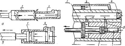 Преимущественное распространение получили двигатели с отводом пороховых газов через боковое отверстие. Системы оружия с отводом пороховых газов и движением поршня назад. Автоматика этого типа имеет две разновидности: движение штока совершается на полную длину отхода затвора (длинный ход поршня), примеры: ВЯ-23, 2А42. ГШ-23, ГШ-30, АКМ; движение штока совершается на небольшой длине, достаточной для отпирания затвора, после чего шток, толкнув ведущее звено и передав ему движение, возвращается в переднее положение (винтовка СВД, карабин СКС). Газовая камера может иметь патрубок, который охватывается поршнем (пулеметы РПД, "Утес", винтовки АВС, СВТ) или патрубок с расположением поршня внутри его (АКМ и др.). В зависимости от характера действия пороховых газов на поршень газовые двигатели делятся на два типа: а) открытого типа (рис. 8.12, а), в которых после некоторого хода поршня происходит выпуск пороховых газов в атмосферу через отверстия в патрубке или направляющей трубке поршня, или путем разъединения поршня с патрубком (ВЯ-23, ГШ-б-23, ГШ-6-30, 2Н42, АКМ); б) закрытого типа (рис. 8.12, б), в которых отработанные пороховые газы частично выходят в зазор между поршнем и направляющей трубкой, а частично выталкиваются поршнем обратно в канал ствола при движении поршня вперед (ГШ-23, ГШ-30). Газовые двигатели открытого типа имеют существенное преимущество, так как свободный выпуск пороховых газов в атмосферу после прохождения поршнем определенного пути уменьшает образование нагара на стенках газовой камеры. По числу камер различают однокамерные и многокамерные двигатели, схемы которых могут быть чрезвычайно разнообразны.