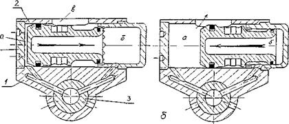 Рис. 8.14. Схема работы газового двигателя с движением поршня вперед-назад Принцип работы такого двигателя представлен на рис. 8.14, где подача порохового газа в переднюю а и заднюю б полость зависит от позиции ствола в многоствольном блоке. В одну полость направляют газ все четные стволы 2, в другую - все нечетные стволы 1 (понятие чисто условное). Отработанный пороховой газ сбрасывается в атмосферу через специальные устройства 3, 4. Оригинально выполнен газоотводный двигатель револьверной пушки Р-23 (рис. 8.15). В стволе 3 выполнены четыре газоотводных отверстия в трех различных сечениях по длине. При выстреле пороховой газ первоначально попадает в самое большое отверстие, из которого через систему газоводов идет на отражение гильзы (на рис. 8.15 не показано). Большая площадь сечения позволяет заполнять большой объем и получать высокое давление для стабильного выбрасывания стреляной гильзы из патронника без ее предварительного страгивания. При дальнейшем движении снаряда открывается следующее отверстие, через которое пороховой газ воздействует на поршень, толкающий патрон в верхнее отверстие барабана пушки. При прохождении снарядом двух отверстий в третьем сечении, газ одновременно поступает в два газовода корпуса 1. В начальный момент (рис. 8.15, а) полость а имеет гораздо меньший объем и большую площадь сечения поршня 2, что приводит к созданию большей силы, которая будет перемещать поршень поперек ствола в сторону полости б. Движение будет продолжаться до тех пор, пока газ из полости а не стравится в атмосферу через отверстие в (рис. 8.15, б), а в полости б поступивший газ будет отсечен от канала ствола 3 поршнем 2. Объем полости б резко уменьшается, но в нем аккумулируется достаточное количество энергии, которая заставит поршень 2 перемещаться в обратную сторону. Движение поршня влево - вправо, через систему рычагов перемещает ленту и вращает блок патронников.