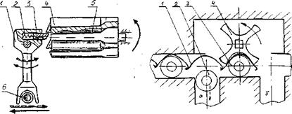 Рис. 8.21. Схема барабанной подачи: 1 - рычаг; 2 - пружина; 3 - защелка; 4 - барабан; 5 - патрон; 6 - затворная рама
