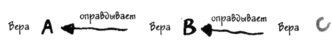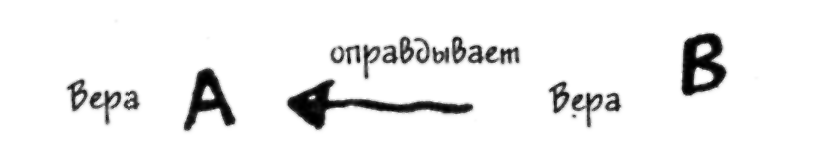 Пиджин: Полагаю, так. Пэт: Я, например, могу обосновать мою веру в то, что телевизионные новости достаточно надежны, сославшись на мою веру в то, что во многих случаях отчеты телевидения о новостях были верны. Назовем эту третью веру «верой С». Но для того чтобы вера В получила обоснование, вера С, в свою очередь, сама должна быть обоснована, так?
