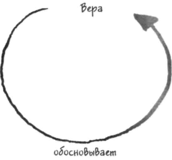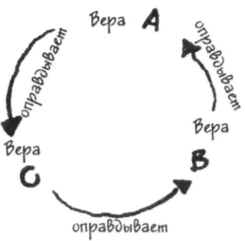Пэт: Ничего не получится. Допустим, единственным обоснованием моей веры в то, что в моем саду живут феи, является моя вера в то, что существуют феи, спустившиеся на землю. А единственным обоснованием моей веры в то, что существуют феи, спустившиеся на землю, является моя вера в то, что в моем саду живут феи. Тогда ни одно из этих двух убеждений не будет обосновано. Такое круговое обоснование вообще не является обоснованием, независимо от того, как много убеждений включено в эту круговую цепочку. Пэт говорит о серьезной проблеме, с которой сталкивается теория, утверждающая, что знание есть обоснованная истинная вера. Но может быть, есть способ обойти ее? Пиджин: Хм... Ладно, я согласен с тем, что круговое обоснование не подходит. Но что, если некоторые убеждения обосновывают сами себя?