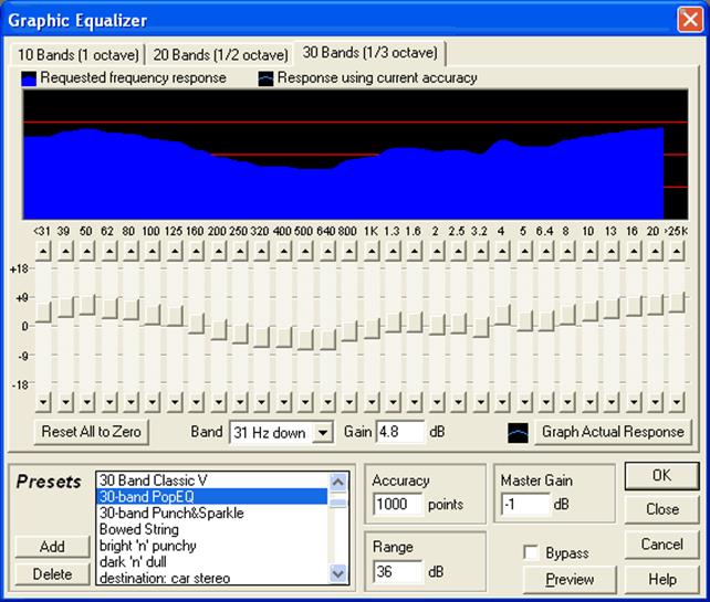 Это набор полосовых фильтров с фиксированными центральными частотами и переменным коэффициентом усиления, которым можно управлять при помощи слайдера (ползунка). В качестве регуляторов принято использовать именно слайдеры, так как их положение представляет собой некое подобие графика АЧХ эквалайзера. Пользователь как бы рисует слайдерами необходимую ему кривую АЧХ. На вход группы включенных параллельно фильтров подается один и тот же сигнал, и задача каждого фильтра состоит в том, чтобы усилить или ослабить "свой" участок спектра в соответствии с положением регулятора коэффициента усиления. Частоты регулирования в графических эквалайзерах унифицированы. Они выбираются из ряда стандартных частот, перекрывающих весь звуковой диапазон и отстоящих друг от друга на некоторый постоянный интервал. Этот интервал может составлять октаву, ее половину, треть. Наиболее широкие возможности, естественно, дают третьоктавные эквалайзеры. В составе любого звукового редактора профессионального уровня обязательно найдется виртуальный графический эквалайзер.