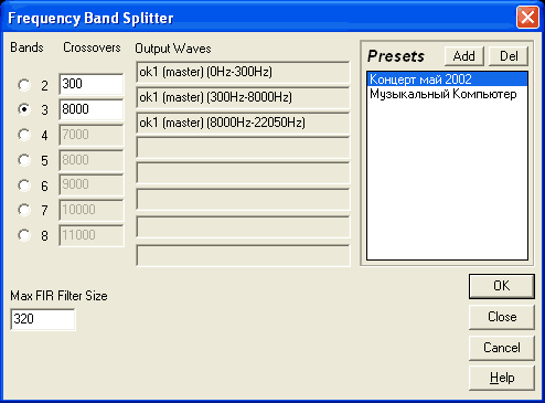 Хотя кроссоверы и не являются эквалайзерами в строгом значении этого слова, их работа основана на тех же принципах. Кроссовер - это набор полосовых фильтров, который разделяет входной сигнал на несколько выходных, со своим строго определенным диапазоном частот. Как известно, практически невозможно создать громкоговоритель, который одинаково хорошо воспроизводил бы частоты всех диапазонов - и высокие, и средние, и низкие. Поэтому для качественного воспроизведения звука во всем диапазоне обычно требуется несколько разных громкоговорителей. В простейшем варианте большой служит для воспроизведения низких частот, а маленький - для высоких. В высококачественных акустических системах к ним добавляется третий, воспроизводящий средние частоты. Естественно, на каждый необходимо подавать сигналы только в том диапазоне частот, на который он рассчитан. Для разделения широкополосного сигнала на несколько полос с разными частотами и применяются кроссоверы. Пассивные кроссоверы (фильтры из конденсаторов, катушек индуктивности и резисторов) включают между выходом усилителя и громкоговорителями. Активные электронные кроссоверы (цифровые или аналоговые, построенные на операционных усилителях) обрабатывают сигнал, поступающий, как правило, с линейного выхода микшера, выхода устройства воспроизведения аудиосигнала или микрофонного усилителя. Сигналы с выходов кроссовера поступают на входы отдельных усилителей и только затем - на громкоговорители. Такие кроссоверы позволяют эффективно использовать мощность усилителей и акустических систем. Без кроссовера не обойтись, если вы хотите получить звук высокого качества в концертном зале или на дискотеке. Однако, если учесть, что усиливаемый сигнал нужно подвергнуть динамической обработке и обработке эффектами, весь комплекс приборов оказывается очень и очень дорогим. Не на каждой концертной площадке и не всякая группа музыкантов может себе такое позволить. Что же делать? Естественно, применять компьютер. О программах для динамической обработки аудиосигнала я рассказал в одной из предыдущих статей, о виртуальных эффектах надеюсь рассказать в будущем. Кроссовер появился в мультитрековом режиме звукового редактора Cool Edit Pro 2. Это виртуальный кроссовер способен распределять спектр сигнала на несколько частотных полос (от двух до восьми). Границы раздела полос вы можете ввести в соответствующих полях.
