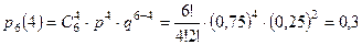 Эта формула называется формулой Бернулли. Пример 1. Вероятность того, что расход электроэнергии за сутки не превысит нормы, равна 0,75. Найти вероятность того, что в ближайшие 6 суток расход электроэнергии в течение 4 суток не превысит нормы. Решение. Вероятность нормального расхода электроэнергии в продолжение каждых из 6 суток постоянна и равна