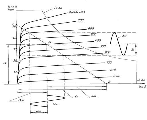 Для получения данных для расчета U кэ и I к на кальке с семейством выходных характеристик транзистора необходимо провести линию нагрузки АВ. Точку В откладывают на оси U кэ при U кэ=12 В. Вторая точка, для проведения линии нагрузки, берется на середине перегиба вольтамперной характеристики с максимальным током базы. Далее линия нагрузки проводится до оси I к, т.е. до I к.max. Через значение I К и U КЭР определяется R к. Расчет ведется в основных единицах.
