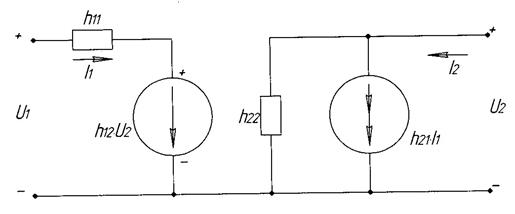 Транзистор является нелинейным элементом, так как его характеристики определяются нелинейными зависимостями между токами и напряжениями. Однако, если входной сигнал по амплитуде меньше по сравнению с постоянным напряжением в точке покоя, то в некоторой области статических ВАХ связь между токами и напряжениями можно считать линейной. В этом режиме, называемом режимом малого сигнала, транзистор можно представить в виде четырехполюсника, основные свойства которого соответствуют общей теории электрических цепей. При этом транзистор считается линейным усилительным элементом. На рис. 1.3 показана схема замещения транзистора для системы h - параметров.