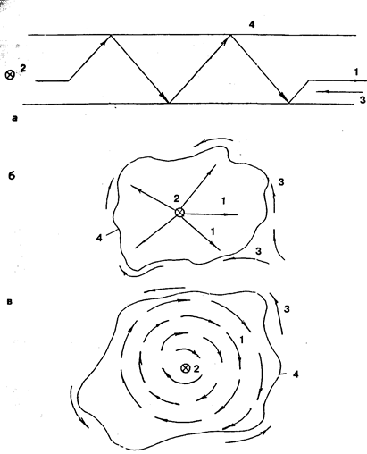 1. Направление движения собаки 2. Положение инструктора-проводника 3. Направление движения воздушных масс (а - прямое, б - меняющееся, в - циркуляроное) 4. Граница участка (полосы) поиска Рис. 4.2. Схемы тактических приемов кинологического поиска пострадавших в завалах: а - поиск "коридором" (челночный); б - поиск "веером"; в - поиск "спиралью"