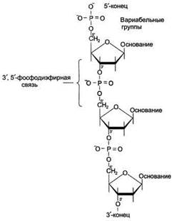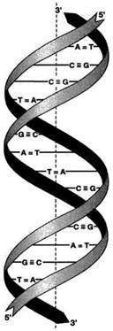 Инициация: присоединение фермента хеликазы (геликазы) к точке начала репликации. Хеликаза расплетает короткие участки ДНК. После этого к каждой из разделившихся цепей присоединяется ДНК-связывающий белок (ДСБ), препятствующий воссоединению цепей. У прокариот имеется еще дополнительный фермент ДНК-гираза, который помогает хеликазе раскручивать ДНК. Элонгация: последовательное комплементарное присоединение нуклеотидов, в результате чего цепь ДНК удлиняется. Синтез ДНК идет сразу на обеих её цепях. Поскольку фермент ДНК-полимераза может собирать цепь нуклеотидов только в направлении от 5’ к 3’, то одна из цепей реплицируется непрерывно (в направлении репликативной вилки), а другая – прерывисто (с образованием фрагментов Оказаки), в противоположном движению репликативной вилки направлении. Первая цепь называется ведущей, а вторая – отстающей. Синтез ДНК идет при участии фермента ДНК-полимеразы. Аналогичным образом синтезируются фрагменты ДНК на отстающей цепи, которые затем сшиваются ферментами – лигазами. Терминация: прекращение синтеза ДНК по достижении нужной длины молекулы. Репарация ДНК – способность молекулы ДНК «исправлять» возникшие в ее цепях повреждения. В этом процессе принимают участие более 20 ферментов (эндонуклеазы, экзонуклеазы, рестриктазы, ДНК-полимеразы, лигазы). Они: 1) находят измененные участки; 2) вырезают и удаляют их из цепи; 3) восстанавливают правильную последовательность нуклеотидов; 4) сшивают восстановленный фрагмент ДНК с соседними участками. ДНК выполняет в клетке особые функции, которые определяются её химическим составом, строением и свойствами: хранение, воспроизведение и реализация наследственной информации между новыми поколениями клеток и организмов. РНК распространены во всех живых организмах и представлены разнообразными по размерам, структуре и выполняемым функциям молекулами. Они состоят из одной полинуклеотидной цепи, образованной четырьмя видами мономеров – рибонуклеотидов: аденилового (А), урацилового (У), гуанилового (Г) и цитозилового (Ц). Каждый рибонуклеотид состоит из азотистого основания, рибозы и остатка фосфорной кислоты. Все молекулы РНК являются точными копиями определенных участков ДНК (генов). Структура РНК определяется последовательностью рибонуклеотидов: - первичная – последовательность рибонуклеотидов в цепи РНК; это своеобразная запись генетической информации; определяет вторичную структуру; - вторичная – закрученная в спираль нить РНК; - третичная – пространственное расположение всей молекулы РНК; третичная структура включает в себя вторичную структуру и фрагменты первичной, которые соединяют один участок вторичной структуры с другим (транспортная, рибосомная РНК). Вторичная и третичная структуры формируются за счет водородных связей и гидрофобных взаимодействий между азотистыми основаниями. Информационная РНК (и-РНК) – программирует синтез белков клетки, поскольку каждый белок кодируется соответствующей и-РНК (и-РНК содержит информацию о последовательности аминокислот в белке, который должен синтезироваться); масса 104-2х106; маложивущая молекула. Транспортная РНК (т-РНК) – 70-90 рибонуклеотидов, масса 23 000-30 000; при реализации генетической информации она доставляет активированные аминокислоты к месту синтеза полипептида, «узнает» соответств