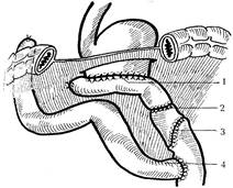 Рис 5.8. Схема резецированного желудка по Ру с удалением демпинг – чувствительной зоны, с формированием искусственного жома и спиралевидного клапана-инвагината. 1 – ГЭА; 2 – искусственный жом (вид со стороны серозной оболочки); 3 – спиралевидный клапан-инвагинат (вид со стороны серозной оболочки); 4 – приводящая кишка. Лечение при легком течении гастрита возможно консервативное в гастроэнтерологическом отделении. При тяжелом течении рефлюкс – гастрита, сопровождающемся атрофией и метаплазией эпителия и желудочных желез, больные подлежат оперативному лечению, как имеющие предраковое заболевание. Подобным пациентам производится резекция желудка с включением приводящей кишки по Ру. В целях предупреждения еюногастрального рефлюкса на отводящей петле формируется искусственный жом из серозно-мышечной стенки (см. рис. 5.6 А, Б, В) в модификации авторов. Синдром приводящей петли при резекции желудка по способу Бильрот – II (рис. 5.9.) развивается в раннем послеоперационном периоде вследствие перегиба и высокой фиксации приводящей петли в области малой кривизны желудка или развития в этой области спаечного процесса.