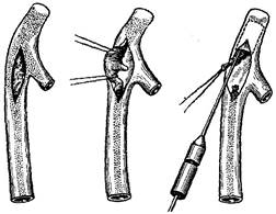 Рис. 12.1. Схема интимтромбэктомии из общей бедренной артерии, для включения в пульсирующий кроваток глубокой артерии бедра.