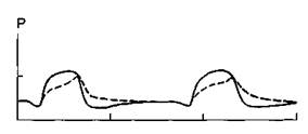 Рис. 4.11. Несоответствие давления, создаваемого респиратором в режиме Pressure Support, давлению в трахее больного. Сплошной линией изображено давление в дыхательном контуре, пунктирной - в трахее.