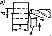 В конце обработки, как только поперечная кромка сверла начнет выходить из металла (в), следует уменьшать подачу, и последний отрезок пути а вершина сверла должна пройти с минимальной подачей.