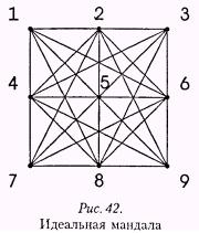 Энергетические лучи мандалы Энергетические связи в мандале Каждая линия в мандале является энергетической связью между двумя точками (вибрациями); эта связь называется лучом. Луч является каналом информации и придает определенное качество взаимодействию планетарных сил, создает особое энергоинформационное поле. Лучи могут быть входящими и выходящими. Планеты, создающие наибольшее количество аспектов, особенно выходящих, будут ключевым звеном мандалы. Освоив их, легче работать с другими планетарными вибрациями, которые взаимодействуют с ключевой планетой. Такая планета определяет основное направление проявления личности. Большое количество стрелок на вертикальных и горизонтальных линиях указывает на постоянство, устойчивость и гармоничный характер человека. Половины вертикальных и горизонтальных линий дают энергию, позволяющую достичь желаемого и смягчить ситуацию, действует как амортизатор. Линии малых диагоналей позволяют работать без надрыва, дают реальную поддержку. Большое количество линий поддержки облегчает путь жизни. Это гармонизирующие линии жизни. Линии больших диагоналей (1-9, 3-7) создают напряжение в мандале. Они указывают на противоборство внешних (1-9) и внутренних (3-7) сил. Половины больших диагоналей, как и линии диагоналей малого внутреннего квадрата, создают напряжение, конфликты между энергиями, могут неожиданно притягивать "удары судьбы", но дают энергию для их преодоления. Напряжение создает и точка повторения цифр (углубления), она усиливает действие вибрации и наполняет и сохраняет энергию в точке. Гармоничное и напряженное действие лучей мандалы оценивается в баллах: Горизонтальные и вертикальные линии +3 балла Половина горизонтальных и вертикальных линий +2 балла Малые диагонали +1 балл Большие диагонали -3 балла Половины диагоналей -2 балла Соединение (повторение одной цифры) -1 балл. Идеальная мандала имеет 72 луча, она может быть объектом для медитации с целью настройки на недостающие или нужные человеку лучи. Все лучи идеальной числовой мандалы имеют свой балл, который указывает или на гармоничную, или на напряженную силу действия луча. Сила всех положительных (гармоничных) лучей в идеальной мандале составляет 92 балла, а отрицательных (напряженных) - 65 баллов. Оценка силы мандалы составляет +27 баллов. Это означает, что гармоничных энергий в нашей жизни больше, чем напряженных, почти на треть. Напряженные лучи в мандале, линии диагоналей (-3) и полуднагоналей (-2), способствуют развитию человека. Безусловно легче жить в спокойной гармоничной обстановке, но развитие чего-либо возможно только через усилия, которые создают напряжения. "Взлетают только против ветра", - говорят пилоты. Если в результате подсчетов мандала получилась с отрицательным баллом, это говорит о том, что жизнь человека будет напряженной, но зато именно через решение проблем, которые вызывают напряжение, он и будет развиваться. Таблица 2 Таблица баллов лучей мандалы