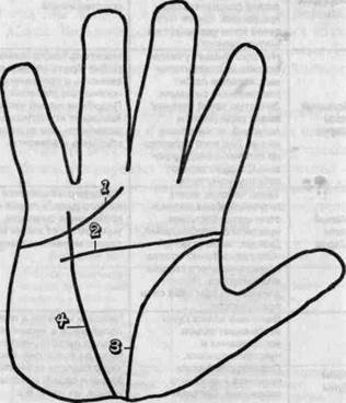 Рис. 2. Линии руки. 1 - Линия Сердца; 2 - Линия Ума (Голо вы); 3 - Линия Жизни; 4 - Линия Судьбы 151 чае всегда можно сказать, что они усиливают влияние основной линии на вашу судьбу или там жизнь), поэтому и пусть идут. Нас интересуют линии Судьбы, Жизни, Ума и Сердца. Начнем с того, где эти самые линии искать, и укажем краткие характеристики каждой линии. Линия Жизни начинается между большим и указательным пальцами и спускается к запястью. По странному стечению обстоятельств, эта линия говорит про жизнь, то есть про ее продолжительность, качество, количество, вес, ускорение и броуновское движение. Линия Сердца начинается под мизинцем и идет по верху ладони по направлению к указательному пальцу. Отвечает за эмоции, отношения, ишемическую болезнь и инфаркты. Линия Ума начинается точно там же, где и Линия Жизни, - между большим и указательным пальцами - и идет поперек ладони под Линией Жизни. Отвечает за ум, интеллект, память, мысли, мышление и концентрацию сил. Также учит не получать по башке и фильтровать базар. Линия Судьбы начинается у основания ладони (там, где кончается Линия Жизни) и поднимается вверх, обычно к мизинцу или безымянному пальцу. Вот не поверишь - отвечает за судьбу и ее формирование. Теперь краткая таблица характеристик линий.