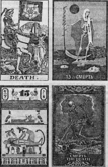 Приложение 3. Сначала я хотел в этом приложении поместить вид всех карт Таро всех моих колод. Потом подумал, что тебе будет достаточно сложно понять изображения 22 старших арканов в десяти вариантах. Да и сканировать все это великолепие, честно говоря, сильно ломает. Поэтому давай посмотрим на простое различие одной карты Таро (старшего аркана номер 13 - Смерть) в разных колодах. Я приведу наиболее интересные варианты, чтобы ты понял сам для себя, что даже одну карту можно настолько по-разному нарисовать (а уж тем более толковать), что это выходит за все грани разумных пределов.
