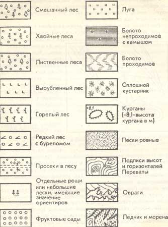 Рельеф местности. Изображается на крупномасштабных картах при помощи горизонталей, которыми называются кривые замкнутые линии, соединяющие на карте точки местности, одинаковые по высоте над уровнем океана. Расстояние по высоте между двумя смежными горизонталями, взятыми на одном скате, называется высотой сечения, а расстояние между горизонталями по плану — заложением. Чем круче скат, тем меньше величина заложения, и наоборот Для определения крутизны ската измеряют кратчайшее расстояние между соседними горизонталями и по шкале подбирают соответствующее ему заложение, против которого читают крутизну ската в градусах. Чтобы определить направление ската по горизонталям, на некоторых из них ставятся перпендикулярные черточки—скатоуказатели (бергштрихи), «смотрящие» своим свободным концом в сторону понижения (рис. 23). Некоторые формы рельефа изображаются не горизонталями, а особыми условными значками. Так, обрывы, овраги, валы, ямы показываются линией с зубчиками, обращенными в сторону крутого склона. При пользовании мелкомасштабными картами туристы могут встретить изображение рельефа способом отмывки (сгущения теней) и гипсометрическим («чем выше, тем темнее»).