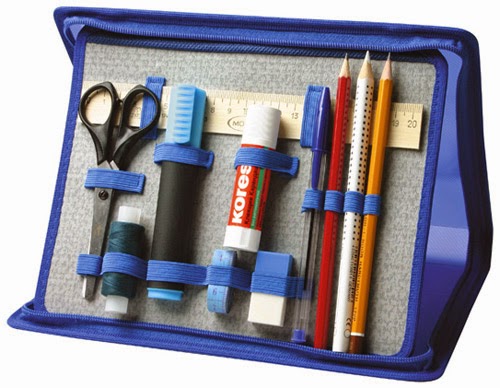 пенал, в котором находятся две ручки с синей пастой, ручка с зеленой пастой, два простых карандаша, цветные карандаши (5 цветов), резинка для стирания;
