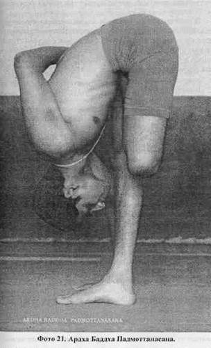 В этой асане девять виньяс, первая, вторая, шестая и седьмая виньясы являются формами асаны (см. фото со второй виньясой). Садхака (духовный ученик) должен практиковать это упражнение под руководством Гуру. Методика выполнения: (фото 21) Станьте прямо. Затем начинайте пураку и поместите правую стопу на левое бедро так, чтобы правая пятка упиралась в низ живота. Заведите правую руку за спину и ухватите ею большой палец правой ноги. Левую руку поместите на пояс. Это первая виньяса. Потом медленно выполните речаку, после чего согнитесь в пояснице и упритесь левой ладонью в пол (слева от левой стопы). Левая нога в колене прямая, нос касается левого колена. Выполните столько пурак и речак, сколько сможете. Это вторая виньяса. Теперь делайте пураку и одновременно поднимайте только голову. Это третья виньяса. Далее выполните речаку и с пуракой выпрямитесь, переместите левую руку на пояс. Это четвертая виньяса. Затем с речакой опустите и выпрямите правую ногу. Это пятая виньяса. Теперь поместите левую стопу на правое бедро, заведите левую руку за спину и ухватите ею большой палец левой ноги, поместите правую руку на пояс и выполните пураку. Это шестая виньяса. Далее, как во второй виньясе, выполняйте речаку и наклонитесь вперед, упритесь правой ладонью в пол (справа от правой стопы). Правая нога выпрямлена в колене, нос касается правого колена. Выполните как можно больше пурак и речак. Это седьмая виньяса. Теперь с пуракой поднимите только голову. Это восьмая виньяса. Затем сделайте речаку и с пуракой выпрямляйтесь и поместите правую руку на пояс. Это девятая виньяса. (Ученикам следует обратить внимание: в таких асанах, как эта, задействованы обе ноги, и движения левой в точности совпадают с движениями правой.) Полезное воздействие: Ардха Баддха Падмоттанасана очищает прямую кишку, пищевод и печень. Она предотвращает газообразование в животе, в том числе вызванное неправильной пищей, и понос. Эта асана доступна людям всех возрастов. Беременные женщины могут практиковать ее только первые три месяца беременности. В этой асане есть еще один важный момент, касающийся устойчивости дыхания. Если ученик сосредоточен главным образом на дыхании, ускользнет форма асаны. С другой стороны, если ум ученика будет направлен на форму асаны, ускользнет речака и пурака. Так что хочу еще раз подчеркнуть, что изучать асаны следует под руководством Гуру.