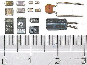 Слева — конденсаторы для поверхностного монтажа; справа — конденсаторы для объёмного монтажа; сверху — керамические; снизу — электролитические.