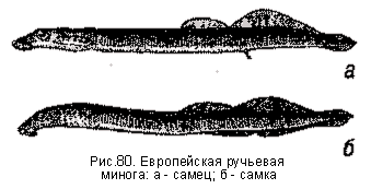 Миноги - рыбообразные водные животные, относящиеся к классу круглоротых Cyclostomata (рис. 80). В состав семейства миног Petromyzonidae входят 8 родов, 24 вида - анадромные и пресноводные организмы; их личинки - свободно живущие, а взрослые особи зачастую паразитируют на рыбах.