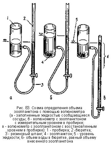 Определение биомассы зоопланктона с помощью волюнометра. Второй метод определения биомассы зоопланктона основан на измерении увеличения объема воды, равного объему внесенного в сосуд зоопланктона. Прибор, называемый волюнометром, состоит из двух стеклянных пипеток, одна из которых тарирована (рис. 83). Пипетки соединены между собой в нижней части резиновым шлангом. Второй сосуд имеет лишь одну отметку - риску. Эти сообщающиеся сосуды заполняют чистой водой до риски. В сосуд с большим горлышком опускают отцеженный зоопланктон. Уровень воды поднимается в обоих сосудах. Для определения объема внесенного влажного зоопланктона необходимо уровень воды в сосуде, куда помещены организмы, восстановить до прежней отметки - риски. Разница объема на тарированной пипетке будет соответствовать объему зоопланктона. Учитывая, что в нем в среднем 90% воды, указанный объем (в мл) необходимо уменьшить на коэффициент 1,1. Это будет примерная величина биомассы зоопланктона, выраженная в миллиграммах или граммах на кубический объем воды (литр).