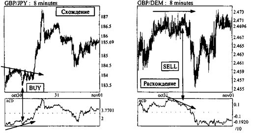 Анализ индикатора OBV проводится аналогично трендовому анализу при пробитии уровней сопротивления и поддержки. Дополнительно следует отметить следующие сигналы покупки-продажи: а) когда ОВV достигает нового низа - это подтверждает силу медведей и говорит о возможном дальнейшем снижении цен, что дает нам основание произвести продажу; б) когда OBV достигает нового верха - это подтверждает силу быков и говорит о возможном дальнейшем повышении цен, что дает нам основание произвести покупку; в) сильные сигналы данный индикатор дает, когда он расходится с ценой. Если цена поднимается на новый верх, a OBV при этом не достигает предыдущего своего максимума или достигает, но с меньшей силой, то это создает бычье расхождение и дает сильный сигнал продажи. Если цена опускается на новый низ, a OBV достигает нового минимума своего значения с еще большей силой, нежели цена, то это говорит о медвежьем схождении и дает сигнал покупки. При этом долгосрочное расхождение более важно, чем краткосрочное. Индикатор Чайкина аккумуляции/распределения (Volume Accumulation - VA) - накопленный объем. Этот индикатор является альтернативой индикатора OBV и был разработан сразу двумя авторами - Марком Чайкиным и Д.Б Ламбером. Формула для расчета VA: VA = {[(С - L) - (Н - С)] / (Н - L)} • V, где С - цена закрытия; L - минимальная цена; Н - максимальная цена; V - объем. NAIMAN NAIMAN Действие этого индикатора основано на том, что при сильно растущем тренде цены закрытия находятся ближе к максимальной цене за день (неделю, месяц, час), а объем торговли превышает среднее значение. На сильном медвежьем тренде будет наблюдаться противоположная картина - цена закрытия будет близка к минимальной цене за период при также больших значениях показателя объема. Сигналами применения индикатора VA будут подтверждающие сигналы роста тренда - однонаправленность динамики индикатора и цены на бычьем тренде и расхождение на медвежьем тренде, а также опровергающие тренд сигналы - бычье расхождение и медвежье схождение индикатора с графиком цены. На основании индикатора Чайкина можно рассчитать также Индекс Чайкина, который представляет n-дневный индикатор денежного потока. Он равен сумме значений индикатора Чайкина за п дней, деленной на сумму объемов за эти п дней: Индекс VA = e VA / e V. Если индекс Чайкина больше ноля и растет, то это сигнал бычьего рынка. Если же индекс ниже ноля и снижается - то вы наблюдаете характеристику медвежьего рынка. На увеличивающихся объемах это сигналы соответственнно покупки и продажи. Применяя к рассчитанной величине VA те приемы, которые были разработаны в методе OSC, мы получаем показатель Осциллятора Чайкина (Chaikin Oscillator - СНО): СНО = SMA(VA,m) - SMA(VA,n), где - m - больший порядок средней; - п - меньший порядок средней. Правила анализа осциллятора Чайкина аналогичны анализу классического осциллятора OSC. Индикатор A/D - Accumulation / Distribution - накопление / распределение. Разработан в 1972 году Ларри Уильямсом и представляет собой накопление разницы между всеми движениями вверх (накопление) в те дни, когда к моменту закрытия цена повысилась и вниз (распределение) в те дни, когда она понизилась: A/D = [(С - О) / (Н - L)] • V, где С - цена закрытия; L - минимальная цена; О - цена открытия; Н - максимальная цена; V - объем. Анализ индикатора A/D аналогичен анализу осцилляторов. Самыми1 сильными сигналами этого индикатора будут сигналы от схо