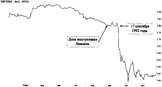 Психология восприятия (жесты и мимика) После прочтения одного заголовка этого пункта возникает закономерный вопрос: "А это нам надо?" Но давайте не торопиться с выводами. Рассмотрим один пример, приведенный в книге Роберта Слейтера "Сорос". 26 августа 1992 года. 08:26. Лорд-канцлер казначейства Великобритании Норман Ламонт отвечает на вопросы журналистов о возможной девальвации фунта стерлингов и, соответственно - выходе страны из Единой Валютной Системы (ЕВС). Краткая характеристика того момента. С 1987 года ведущие европейские валюты были привязаны к курсу немецкой марки. Например, фунт был приравнен к 2.95 марки. В 1992 году стало ясно, что многие валюты имели завышенный курс (среди них и фунт) по отношению к более сильным валютам (немецкая марка, голландский гульден и французский франк). Депрессия в английской экономике давала мало оснований надеяться, что Великобритания сможет долго поддерживать столь высокий курс фунта по отношению к немецкой марке. Спекулянты валютой почуяли запах свежей крови. Они решили, что Англии придется выйти из ЕВС. К указанной дате курс установился на уровне 2.795 марок за фунт, что было близко к предельно допустимой отметке в 2.78 марки. В случае пробития данного курса Великобритания NAIMAN NAIMAN вынуждена былы бы выйти из ЕВС и девальвировать фунт. Эта мера оживила бы экономику страны, но привела к отставке правительства. Последнего и боялся лорд-канцлер. Поэтому он принимал все меры для сдерживания ситуации. Но был ли Норман Ламонт уверен в том, что ему это удастся. Когда он отвечал на вопросы журналистов в тот знаменательный день, Кэтрин Чарлтон (специалист по голосу и произношению) отметила, что: "Этот человек испытывает глубокие сомнения". "Тайну канцлера выдала частота миганий. По словам Чарлтон, большинство людей мигают 6-8 раз в минуту. А Ламонт мигнул 64 раза за 45 секунд! Как правило, когда люди говорят правду или то, что думают на самом деле, их глаза спокойны и неподвижны. Язык жестов, частота миганий и склонность не отвечать на вопросы. Все признаки налицо. Спекулянты почуяли слабость правительства."* Курс упал не сразу, только 17 сентября. В день, который Великобритания назовет "черной средой", курс упал до 2.71 марки, достигнув в итоге свободного падения рекордно низкой отметки в 2.40 марки. На приведенном ниже рисунке можно увидеть все перипетии того времени. Рисунок 4.4