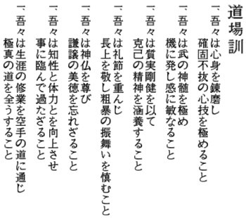 Клятва Клянемся! Мы будем тренировать наши сердца и тела для достижения твердого непоколебимого духа. Клянемся! Мы будем следовать истинному смыслу воинского пути, чтобы наши чувства всегда были наготове. Клянемся! Мы будем стремиться культивировать дух самоотрицания. Клянемся! Мы будем соблюдать правила этикета, уважение к старшим и воздерживаться от насилия. Клянемся! Мы будем стремиться к мудрости и силе, не ведая других желаний. Клянемся! Мы будем следовать нашим богам и воинскому пути и никогда не забудем истинную добродетель - скромность. Клянемся! Всю нашу жизнь, через изучение каратэ, мы будем стремиться выполнить истинное предназначение пути Кекусинкай. Хитоцу! Варэварэ ва, синсин о рэмаси, какко фубацу но синги о кивамэру кото. Хитоцу! Варэварэ ва, буно сидзуй о кивамэ, ки ни хасси кан ни бин нару кото. Хитоцу! Варэварэ ва, ситцудзицу гокэн о моттэ, кокки но сэйсин о канье суру кото. Хитоцу! Варэварэ ва, рэйсицу о омондзи, тедзи о кейси, собо но фурумай о цуцусиму кото. Хитоцу! Варэварэ ва, синбуцу о тоотоби, кэндзе но битоку о васурэдзару кото. Хитоцу! Варэварэ ва, тисэй то тайреку то о ходзе сасе, кото ни нодзондэ, аяматадзару кото. Хитоцу! Варэварэ ва, сегай но сюге о каратэ но мити ни цудзи, Кекусин но мити о матто суру кото