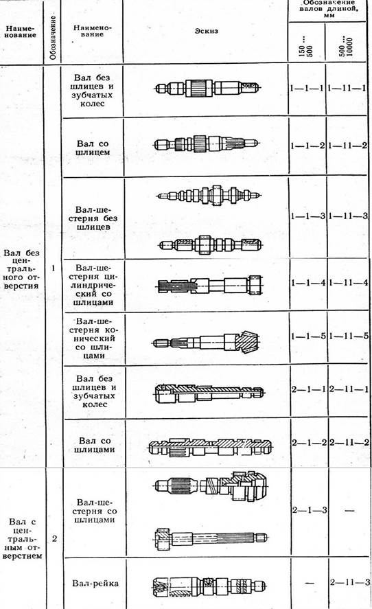 ВАЛЫ Конструкции, материалы, термообработка Валы различают по служебному назначению, конструктивной форме, размерам, конструкционному материалу. Встречаются валы бесступенчатые и ступенчатые, цельные и пустотелые, гладкие и шлицевые, валы-шестерни, а также комбинированные в различных сочетаниях. Основные виды, группы и типы валов представлены на рис. 2.1. По форме и положению геометрической оси валы могут быть прямые, коленчатые, кривошипные и кулачковые. Около 85% общего количества типоразмеров ступенчатых валов в машиностроении составляют валы длиной 150…1000 мм. Наиболее часто валы изготавливают из конструкционных и легированных сталей, таких как сталь 20, 30, 35, 40, 45, 20Х, 35Х, 40Х, 50Х, 40Г2, 18ХГТ, 25ХГМ, 20ХН3А, 20ХГНМ, 19ХГН, 15ХНТ2А. Применяют сырые и термообработанные валы. Валы из высокоуглеродистых сталей подвергают как объемной закалке, так и локальной (поверхностной) закалке наиболее ответственных поверхностей с использование нагрева ТВЧ на глубину 1,5…5,0 мм (HRC 32…42), а на поверхности - HRC 59…63. Валы, изготовляемые из низкоуглеродистых сталей, цементируют или нитроцементируют на глубину 0,7…1,2 мм и после закалки и отпуска получают твердость поверхности HRC 52…60. Валы из азотируемых сталей азотируют на глубину 0,3…0,5 мм, обеспечивая твердость поверхностей HRC 40…58 [17]. Основные схемы базирование Основными конструкторскими базами большинства валов являются поверхности опорных шеек. Однако в качестве технологических баз их используют существенно реже. Применение таких баз при обработке наружных поверхностей, как правило, затруднительно. Особенно это касается выполнения принципа постоянства баз. Поэтому при обработке валов в большинстве случаев используют искусственные технологические