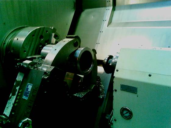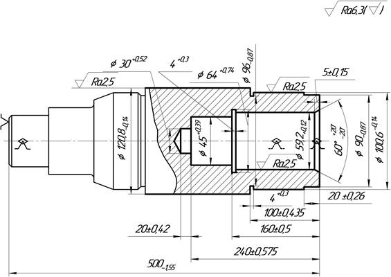 В процессе выполнения операции самоцентрирующий люнет и задний центр могут свою базирующую роль осуществлять попеременно, заменяя друг друга по необходимости. Последнее особенно рационально для обработки за один установ как наружных, так и внутренних поверхностей валов и других заготовок с центральным отверстием или выточками на торце (см. рис. 2.1). На рис. 2.3 приведен операционный эскиз подобной токарной операции.