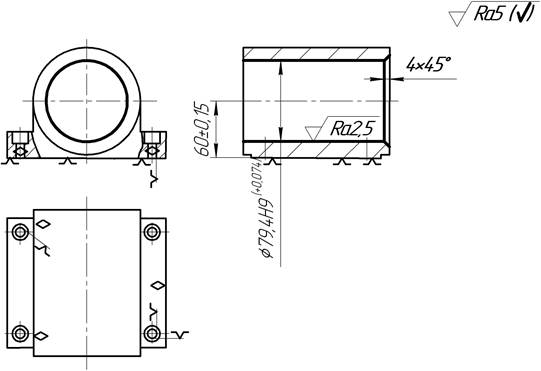 Рис. 6.4. Операционный эскиз радиально-сверлильной операции (операция выполняется с использованием накладного кондуктора, который базируется по отверстию А и боковой плоскости) 045 Плоскошлифовальная Шлифовать (при необходимости) плоскость основания. Технологические базы – поверхность основного отверстия или обработанная плоскость, параллельная шлифуемой (в зависимости от требуемой точности расстояния от обрабатываемой плоскости до оси основного отверстия). Оборудование: плоскошлифовальный станок с прямоугольным или круглым столом. 050 Расточная (координатно-шлифовальная) Тонкое растачивание или шлифование основного отверстия. Технологическая база - базовая плоскость и два отверстия. Оборудование: алмазно-расточной станок или координатно-шлифовальный. Операционный эскиз соответствует рис. 6.3. С целью повышения производительности, а также увеличения точности взаимного расположения обработанных поверхностей большинство операций (№ 025, 030, 035, 040) за исключением операций подготовки технологических баз (№ 015, 020) и финишной обработки (отделки) основных поверхностей (№ 045, 050) часто концентрируют (объединяют) в одну или две операции. Обработку выполняют на горизонтально-расточном (единичное производство), многооперационном (серийное) или агрегатном (крупносерийное и массовое производство) станках. Особенности обработки разъемных корпусов В маршрут обработки разъемных корпусов дополнительно к выше приведенным операциям включают: • обработку поверхности разъема у основания (фрезерная операция); • обработку поверхности разъема у крышки (фрезерная операция); • обработку крепежных отверстий на поверхности разъема основания (сверлильная операция); • обработку крепежных отверстий на поверхности разъема крышки (сверлильная операция); • сборку корпуса промежуточную (слесарно-сборочная операция); • обработку двух точных отверстий (обычно выполняется сверление и развертывание) под цилиндрические или конические штифты в плоскости разъема собранного корпуса. Литература 1. Обработка металлов резанием: Справочник технолога / А. А. Панов, В. В. Аникин, Н. Г. Бойм и др.; Под общ. ред. А. А. Панова. – М.: Машиностроение, 1988. - 736 с. 2. Основы технологии машиностроения: Учебник для вузов / Под ред. В. С. Корсакова. – М.: Машиностроение, 1977. – 416 с. 3. Технологический классификатор деталей машиностроения и приборостроения. М.: Изд-во стандартов, 1987. – 256 с. 4. Технологические расчёты при проектировании процессов механической обработки заготовок / А. В. Акимов, Э. Л. Жуков, Б. Я. Розовский, В. А. Скраган: Учебное пособие. Л.: ЛПИ им. М. И. Калинина, 1980. – 76 с. 5. Технология машиностроения: Учебник для машиностроительных специальностей вузов / А.А. Гусев, Е.Р. Ковальчук, И.М. Колесов и др. – М.: Машиностроение, 1986. – 480 с. 6. Технология машиностроения. С.А.Картавов и др. – Киев: Вища школа. Головное изд-во, 1984. – 272с. 7. Технология производства гусеничных и колёсных машин. Учебное пособие для студентов машиностроительных специальностей вузов / Н. М. Капустин, К. М. Сухоруков, Р. К. Мещеряков и др.: Под общ. ред. Н. М. Капустина. – М.: Машиностроение, 1989. – 368 с. 8. Справочник технолога- машиностроителя. В 2-х т. Т.1 / Под ред. А. Г. Косиловой и Р. К. Мещерякова – 4-е изд., переработанное и дополненное – М.: Машиностроение, 1986. – 656с. 9. Справочник технолога-машиностроителя. В 2-х т. Т.2 / Под ред. А.Г.Ко